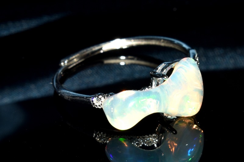 オパールの語源は、古代サンスクリット語の「宝石」を意味する「ウパラ」であるとされています。オパールは水中で微小な珪酸球が沈殿し、岩石の隙間などに密に蓄積して形成される石です。水晶等と同じく、珪素をメインにする鉱物ですが、その成り立ちから、水分が多く、硬度も非常に柔らかい石です。
