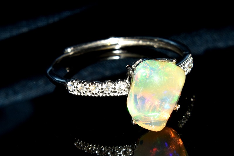オパールの語源は、古代サンスクリット語の「宝石」を意味する「ウパラ」であるとされています。オパールは水中で微小な珪酸球が沈殿し、岩石の隙間などに密に蓄積して形成される石です。水晶等と同じく、珪素をメインにする鉱物ですが、その成り立ちから、水分が多く、硬度も非常に柔らかい石です。