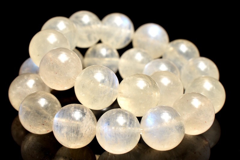 ムーンストーンは長石(フェルドスパー)という鉱物グループの一種。長石グループの石には、ラブラドライト、サンストーン、アマゾナイトなどがあり、同じ仲間とは思えないほど多種多様です。ムーンストーンはオーソクレース(正長石)を主とし、アルバイト(曹長石)を含むものをいい、この二種類の長石の層が重なり合って、光の内部反射と干渉が起こり、「シラー(シーン)」と呼ばれる幻想的な光の効果を見ることができます。この光こそがムーンストーンの最も特徴的な魅力でもあり、名前の元となるイメージをかきたてたのだと思います。一般的に知られるムーンストーンは乳白色、または半透明の物が多いようですが、他にもオレンジ、ピンク、イエロー、グリーン、灰色がかったグリーン、灰色、茶色、褐色など様々な色があります。