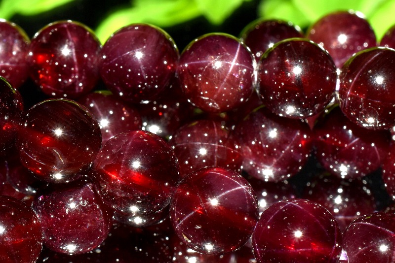 スターガーネットは金紅石(ルチル)や角閃石など針状の結晶を含むことで4条あるいは6条のスターが浮かび上がる、アルマンディンという種類のガーネットです。どんな石でもスターがでるというものではなく、針状結晶の多いものを正しく加工することでスター効果があらわれます。