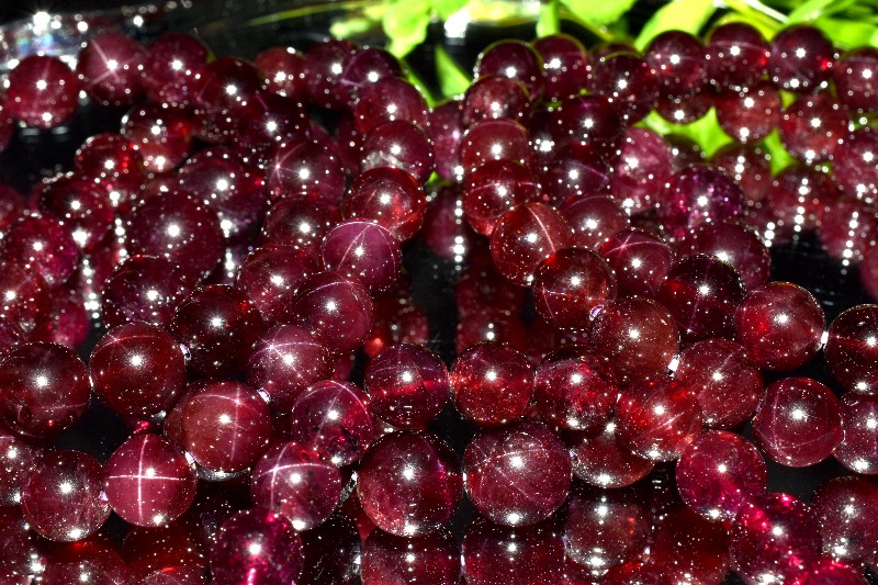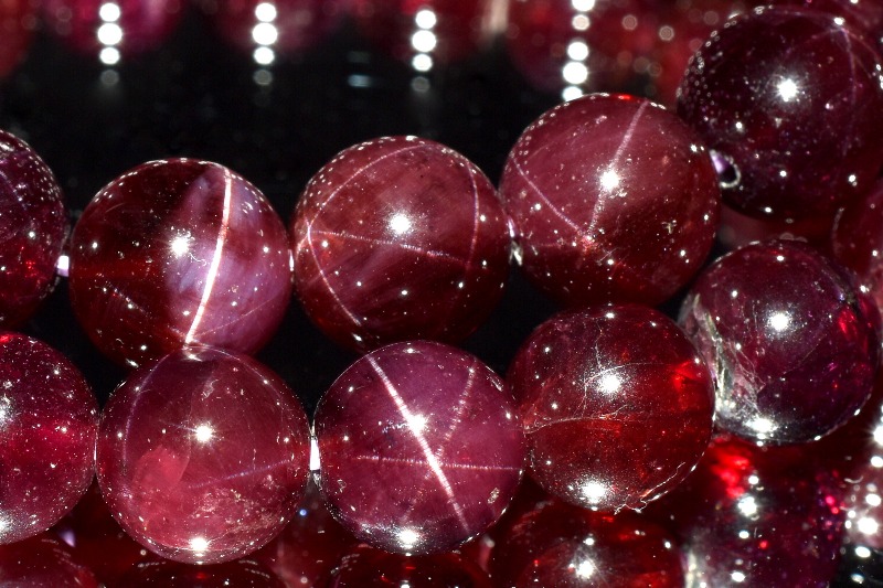 スターガーネットは金紅石(ルチル)や角閃石など針状の結晶を含むことで4条あるいは6条のスターが浮かび上がる、アルマンディンという種類のガーネットです。どんな石でもスターがでるというものではなく、針状結晶の多いものを正しく加工することでスター効果があらわれます。