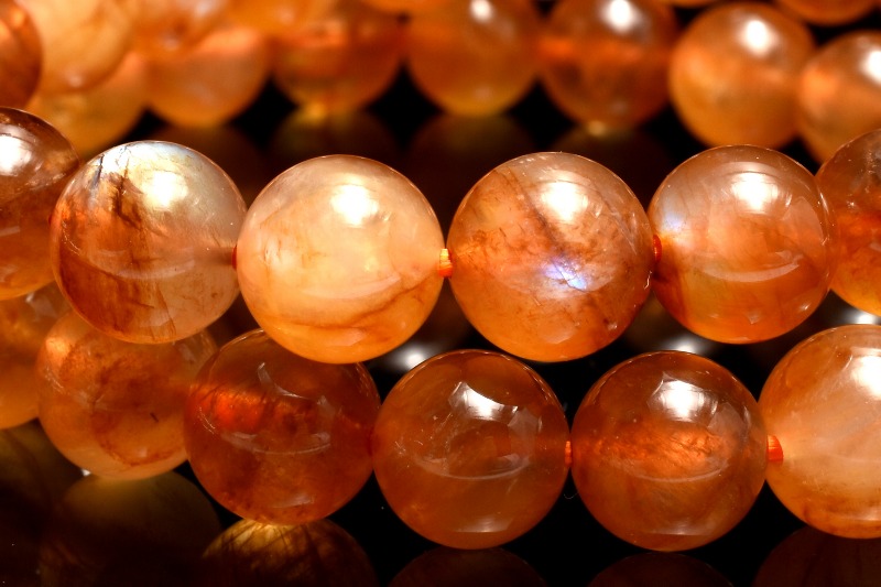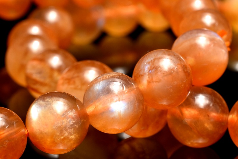 ムーンストーンは長石(フェルドスパー)という鉱物グループの一種。長石グループの石には、ラブラドライト、サンストーン、アマゾナイトなどがあり、同じ仲間とは思えないほど多種多様です。ムーンストーンはオーソクレース(正長石)を主とし、アルバイト(曹長石)を含むものをいい、この二種類の長石の層が重なり合って、光の内部反射と干渉が起こり、「シラー(シーン)」と呼ばれる幻想的な光の効果を見ることができます。この光こそがムーンストーンの最も特徴的な魅力でもあり、名前の元となるイメージをかきたてたのだと思います。一般的に知られるムーンストーンは乳白色、または半透明の物が多いようですが、他にもオレンジ、ピンク、イエロー、グリーン、灰色がかったグリーン、灰色、茶色、褐色など様々な色があります。