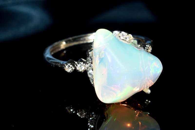 オパールの語源は、古代サンスクリット語の「宝石」を意味する「ウパラ」であるとされています。オパールは水中で微小な珪酸球が沈殿し、岩石の隙間などに密に蓄積して形成される石です。水晶等と同じく、珪素をメインにする鉱物ですが、その成り立ちから、水分が多く、硬度も非常に柔らかい石です。