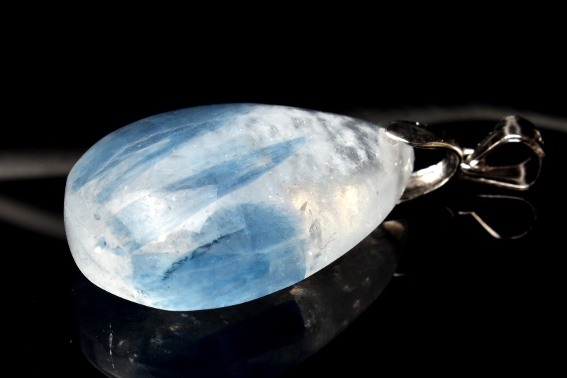透明感のあるシリカの中に青い柱のようなアクアマリン、白いもこもこした内包物が入っている。アクアマリンはしっかり青味がある。厚みがあってコロンとした可愛いフォルム。