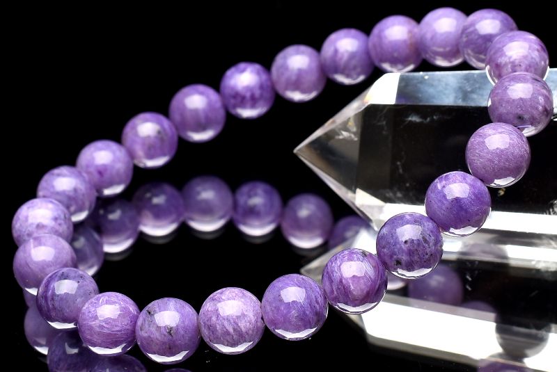 「チャロアイト」は、「スギライト」や「ラリマー」と同じく、世界三大ヒーリングストーンの一つに数えられる石です。油彩画のような質感を持つ芸術的な印象を持つ石で、この不思議な模様は、黒色:エジリン(Aegirine錐輝石)、帯状の灰色:マイクロクリン(Microcline微斜長石)、白色:カリ長石(PotassiumFeldspar)、黄緑色:カナサイト(Canasite)、淡黄色:ティクナクサイト(Tinaksite)などの鉱物が、マーブル状に混ざりあうことから成り立っています。薄紫色の彩色は不純物のマンガンに起因します。