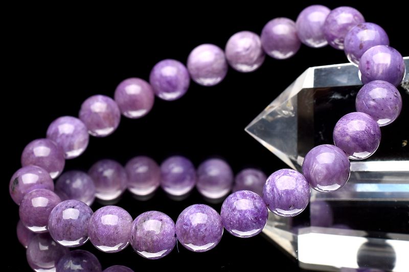 「チャロアイト」は、「スギライト」や「ラリマー」と同じく、世界三大ヒーリングストーンの一つに数えられる石です。油彩画のような質感を持つ芸術的な印象を持つ石で、この不思議な模様は、黒色:エジリン(Aegirine錐輝石)、帯状の灰色:マイクロクリン(Microcline微斜長石)、白色:カリ長石(PotassiumFeldspar)、黄緑色:カナサイト(Canasite)、淡黄色:ティクナクサイト(Tinaksite)などの鉱物が、マーブル状に混ざりあうことから成り立っています。薄紫色の彩色は不純物のマンガンに起因します。