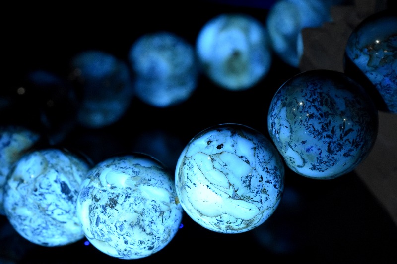 紫外線を当てると透明感のあるブルーに輝き神秘さを感じます。