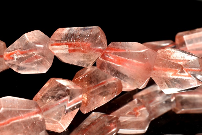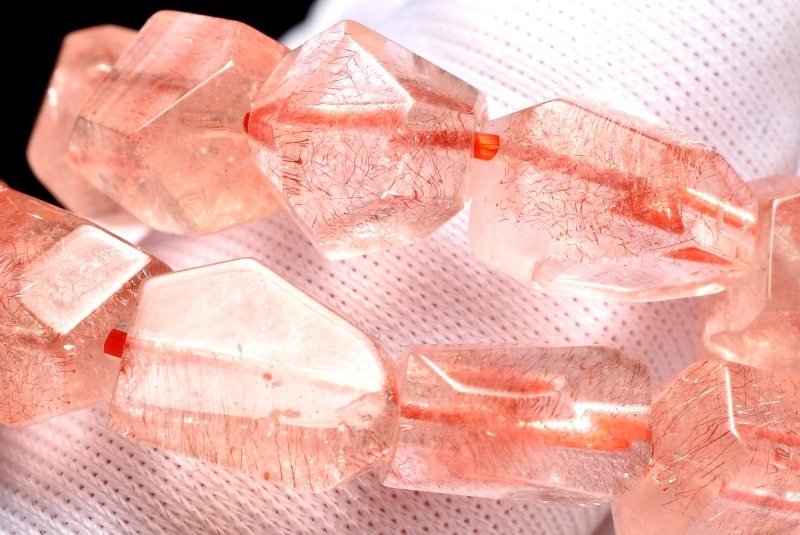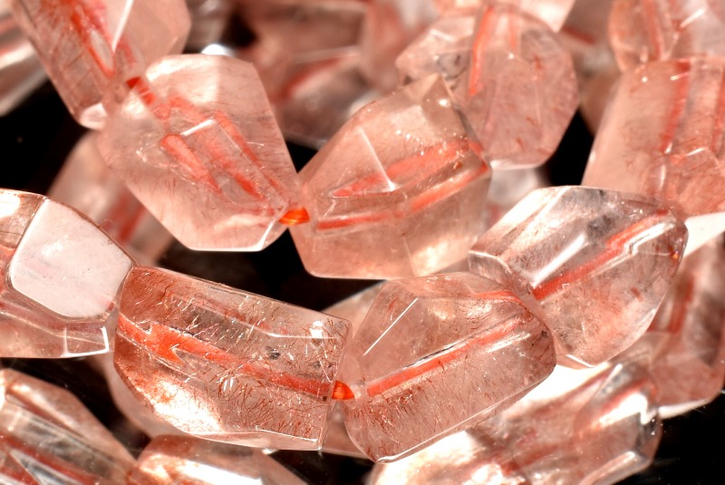 赤く美しい物はファイアークォーツ、その他にもハーレクインクォーツ、ハーレクイン水晶など流通名を多数持った天然石です。