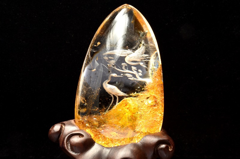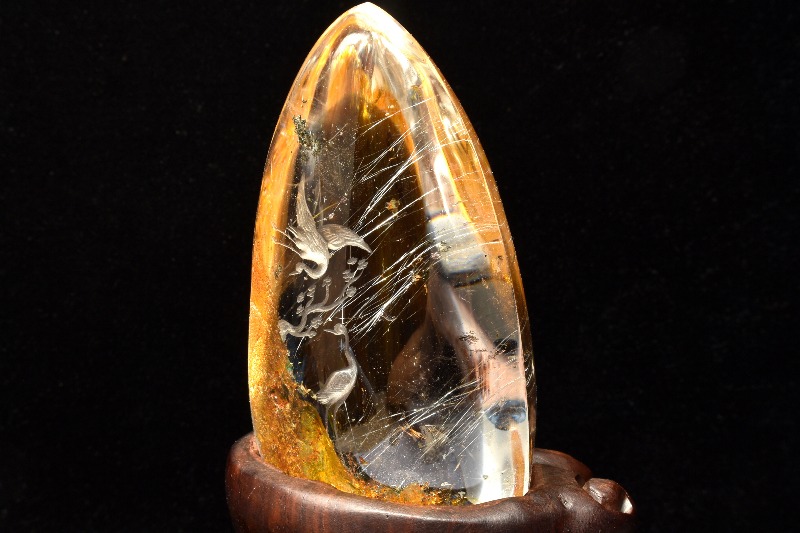 【1点物】ルチル入り◇繊細彫刻 ライモナイトインクォーツ 65x47x111mm 鶴内彫り 木製台座付き 置物 _CG6558【宅急便のみ】