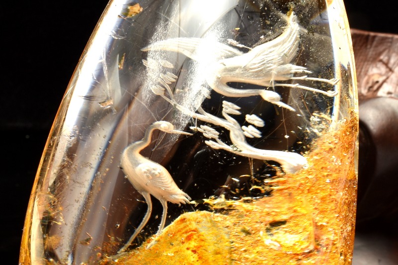 透明度の高い水晶の中に繊細な彫刻が見事に浮かび上がっています。