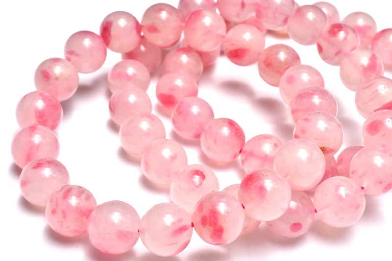ロードナイトの和名は薔薇輝石。マンガンが主成分で、一般的に見られるものはピンク色ですが、鉄が多く含まれるとより赤くなります。黒い斑や筋状の部分は酸化マンガンです。
