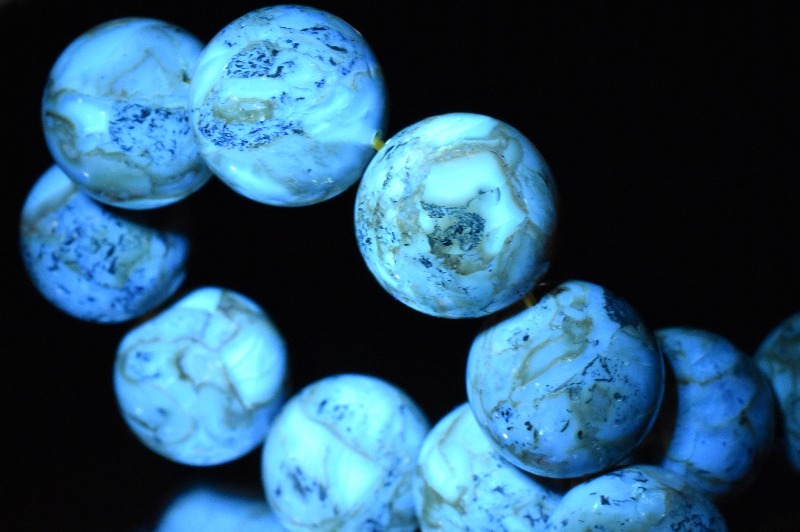 紫外線を当てると透明感のあるブルーに輝き神秘さを感じます。