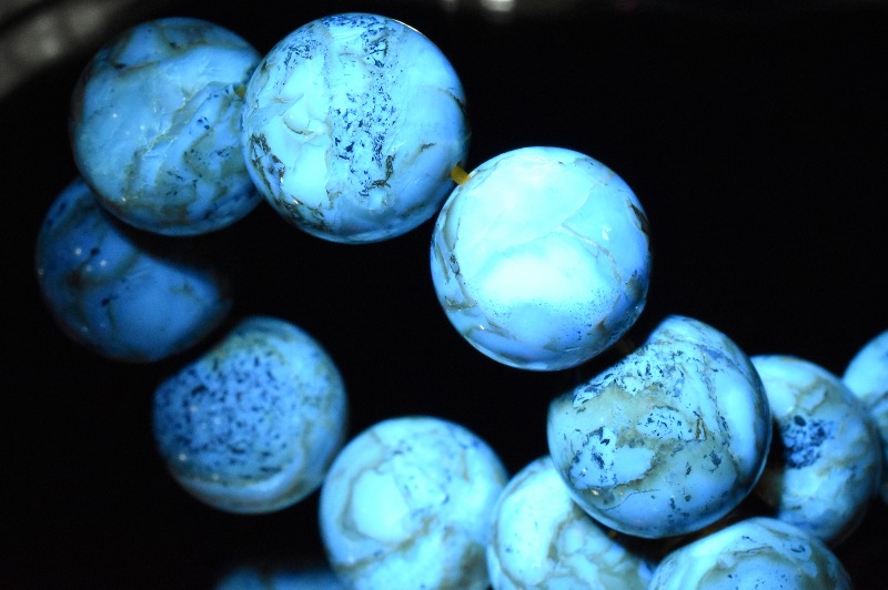 紫外線を当てると透明感のあるブルーに輝き神秘さを感じます。