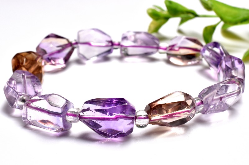 【1点物】透明◇バイカラー アメトリン 11.5-15x6.5-11(丸玉4)mm 原石ラフカット ブレスレット _MA8604