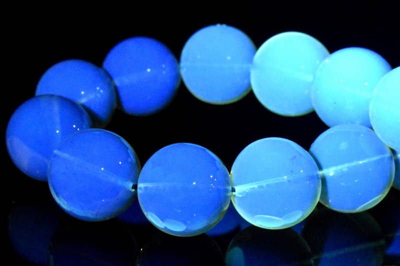 紫外線を当てると透明感のあるブルーに輝き神秘さを感じます。