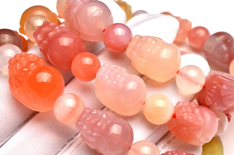 四川省産◇塩源瑪瑙 ピンクアゲート(桃色瑪瑙) 15-17x11-13(丸玉8.5)mm 貔貅彫刻 ブレスレット 1個売り _BG6001