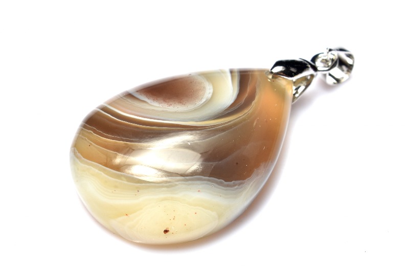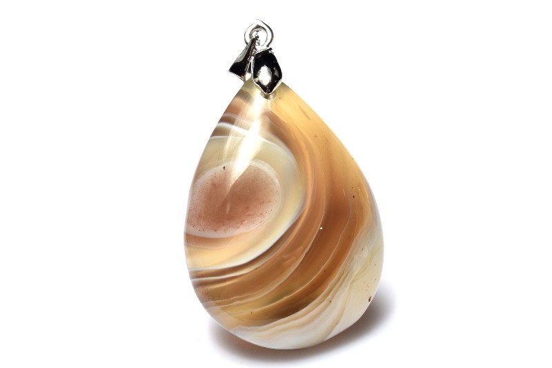 アゲート(めのう)の一種で、色合いはアイボリー、ベージュ、ブラウンなど落ち着いた色合いのものや、オレンジ、ピンクなども見られます。