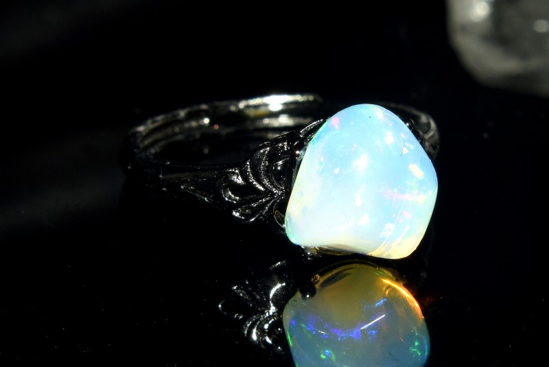 オパールの語源は、古代サンスクリット語の「宝石」を意味する「ウパラ」であるとされています。オパールは水中で微小な珪酸球が沈殿し、岩石の隙間などに密に蓄積して形成される石です。水晶等と同じく、珪素をメインにする鉱物ですが、その成り立ちから、水分が多く、硬度も非常に柔らかい石です。