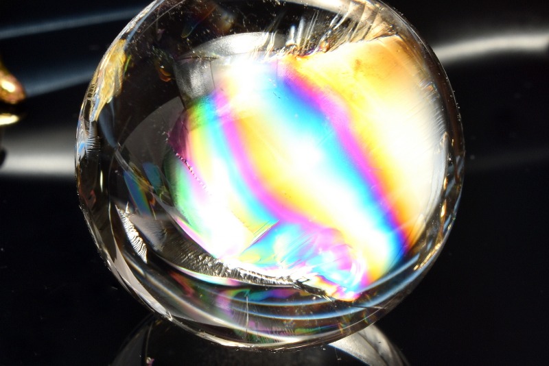 この美しい虹色がなぜ内包されたかというと、地殻の変動や外からの力が水晶に加わることで亀裂が生じ、それが虹色の分散光を放つためとされています。