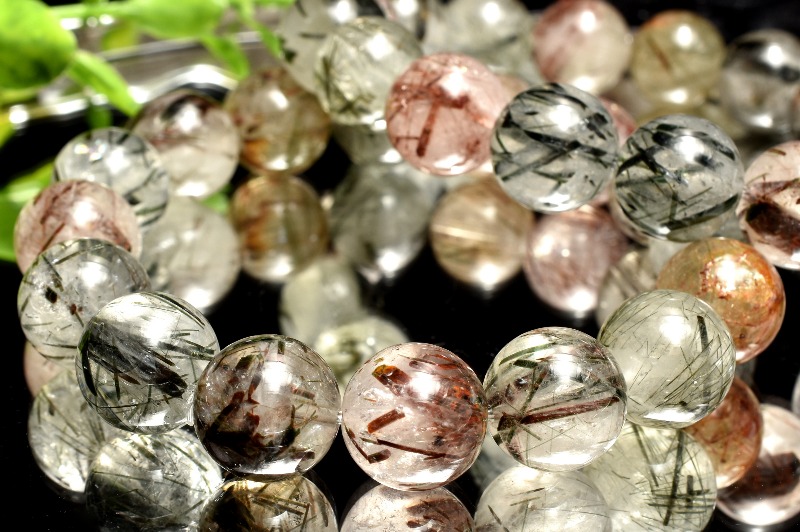 針入り水晶ゴールドルチル、レッドルチル、グリーンルチルの上質なビーズをセレクトして配列しましたミックスルチルクォーツです。