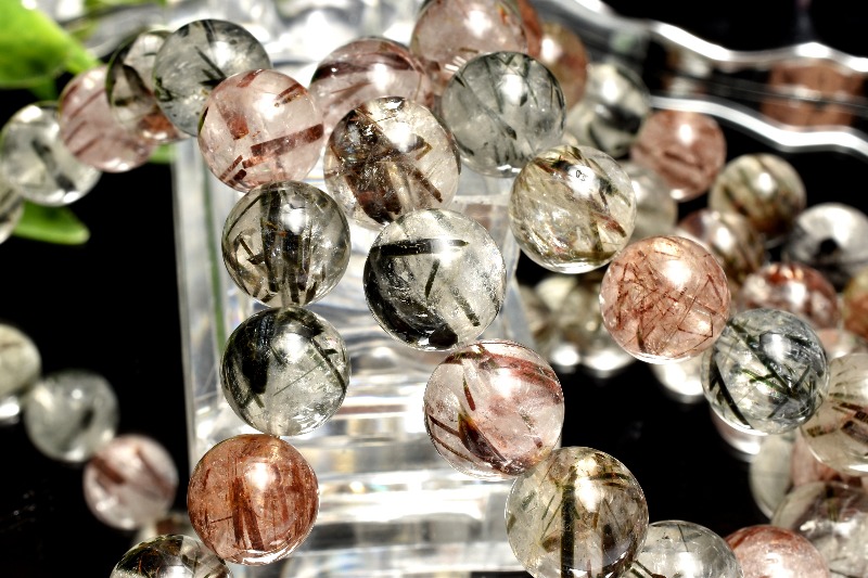 針入り水晶ゴールドルチル、レッドルチル、グリーンルチルの上質なビーズをセレクトして配列しましたミックスルチルクォーツです。