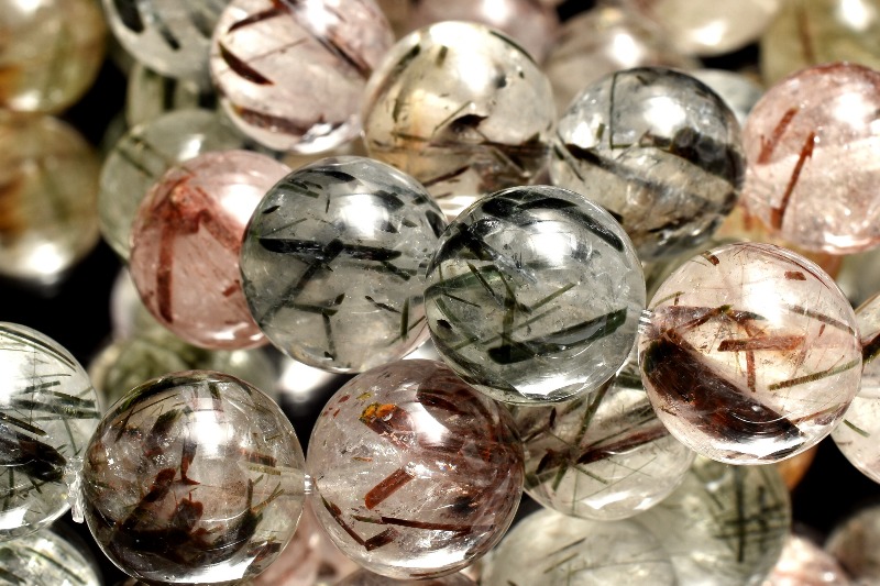 針入り水晶ゴールドルチル、レッドルチル、グリーンルチルの上質なビーズをセレクトして配列しましたミックスルチルクォーツです。