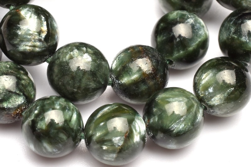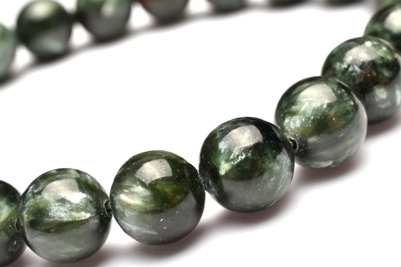 深緑色の地石の中に、白色〜銀色に輝く色彩の模様が「天使の羽」のように見えることがセラフィナイトの特徴です。
