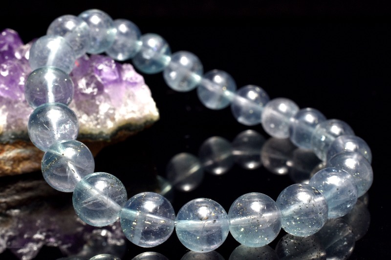 特徴・意味透明度の高い淡いブルーのフローライトに星々のようにキラキラ輝くパイライトが内包された幻想的で美しいブレスレットです。