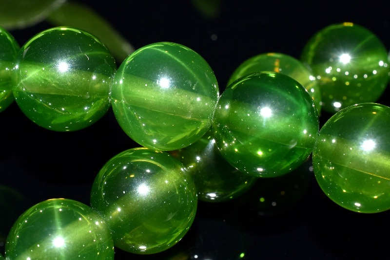 高発色グリーンに、光を当てると美しいスター効果が楽しめる人気の合成石です。