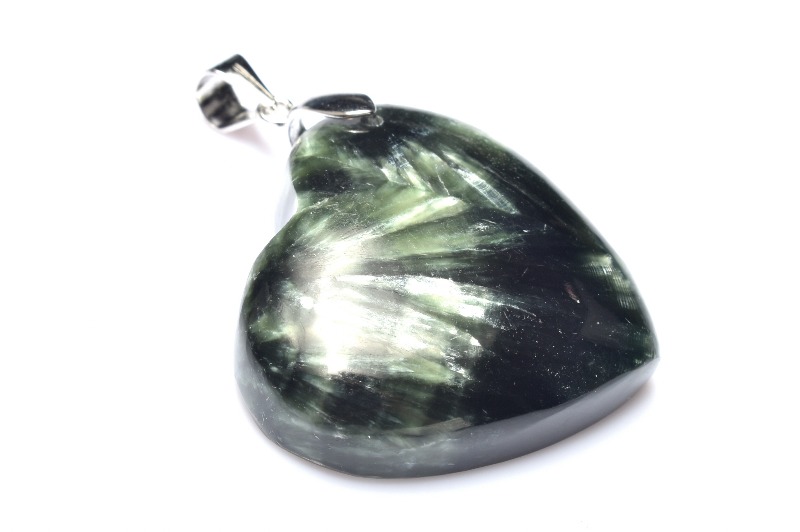 深緑色の地石の中に、白色〜銀色に輝く色彩の模様が「天使の羽」のように見えることがセラフィナイトの特徴です。