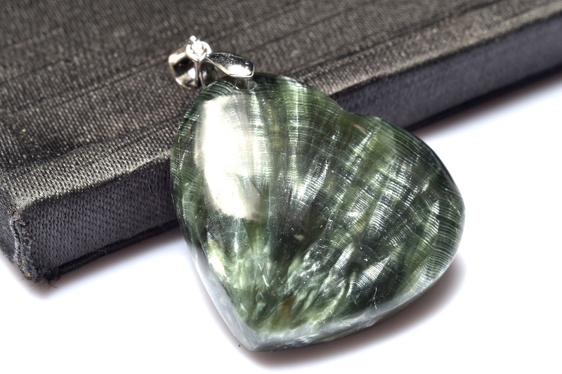 深緑色の地石の中に、白色〜銀色に輝く色彩の模様が「天使の羽」のように見えることがセラフィナイトの特徴です。