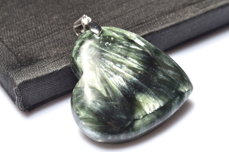 深緑色の地石の中に、白色〜銀色に輝く色彩の模様が「天使の羽」のように見えることがセラフィナイトの特徴です。