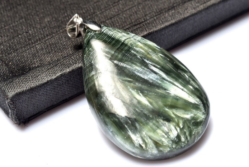 深緑色の地石の中に、白色〜銀色に輝く色彩の模様が「天使の羽」のように見えることがセラフィナイトの特徴です。