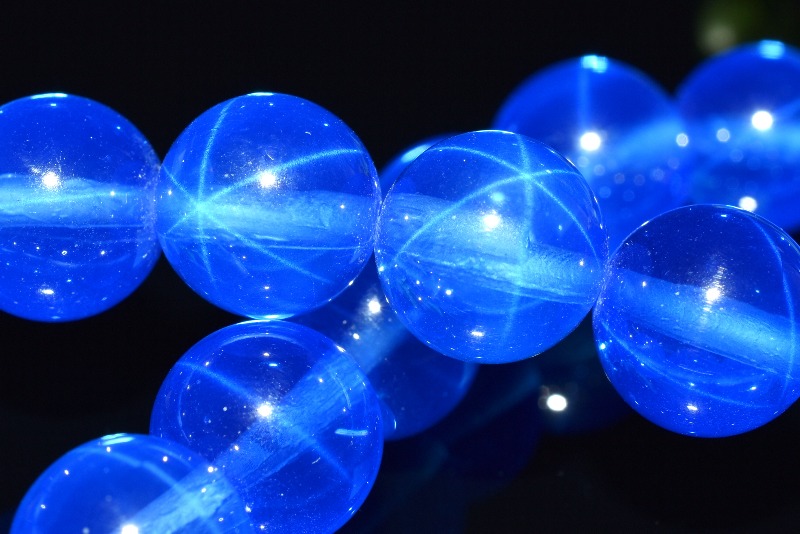 美しい高発色ブルーに、光を当てると美しいスター効果が楽しめる人気の合成石です。