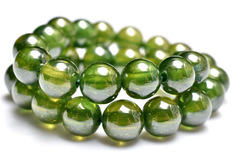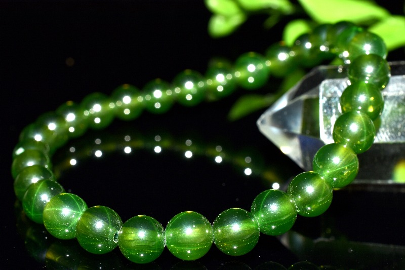 高発色グリーンに、光を当てると美しいスター効果が楽しめる人気の合成石です。
