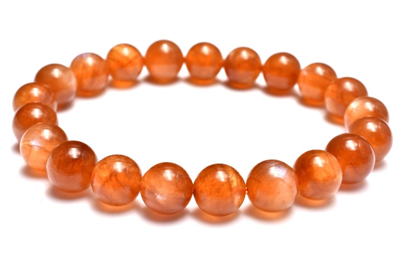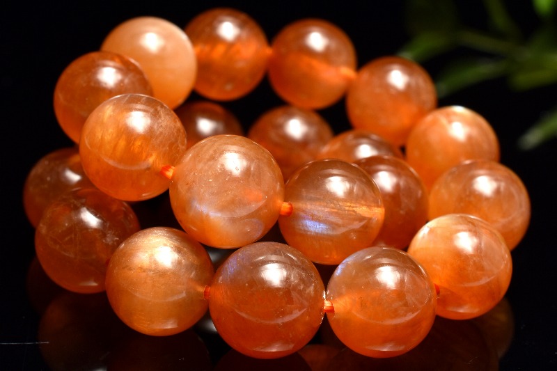 ムーンストーンは長石(フェルドスパー)という鉱物グループの一種。長石グループの石には、ラブラドライト、サンストーン、アマゾナイトなどがあり、同じ仲間とは思えないほど多種多様です。ムーンストーンはオーソクレース(正長石)を主とし、アルバイト(曹長石)を含むものをいい、この二種類の長石の層が重なり合って、光の内部反射と干渉が起こり、「シラー(シーン)」と呼ばれる幻想的な光の効果を見ることができます。この光こそがムーンストーンの最も特徴的な魅力でもあり、名前の元となるイメージをかきたてたのだと思います。一般的に知られるムーンストーンは乳白色、または半透明の物が多いようですが、他にもオレンジ、ピンク、イエロー、グリーン、灰色がかったグリーン、灰色、茶色、褐色など様々な色があります。