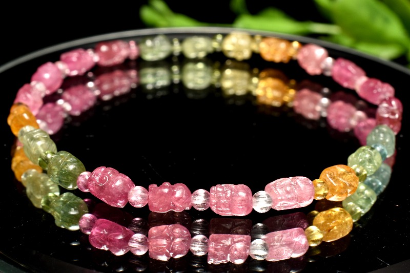 【1点物】AAA☆透過性あり トルマリン 5-5.5x4(丸玉2.5)mm 貔貅彫刻 ブレスレット _MA9932