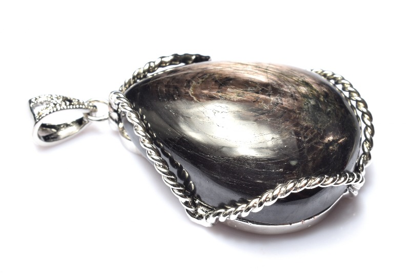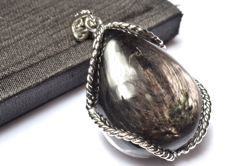 黒色の石の中に白色から桃色のシラー(光効果)が浮かび上がる美しい天然石です。
