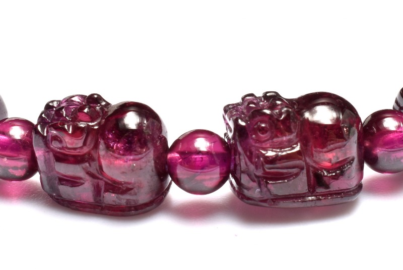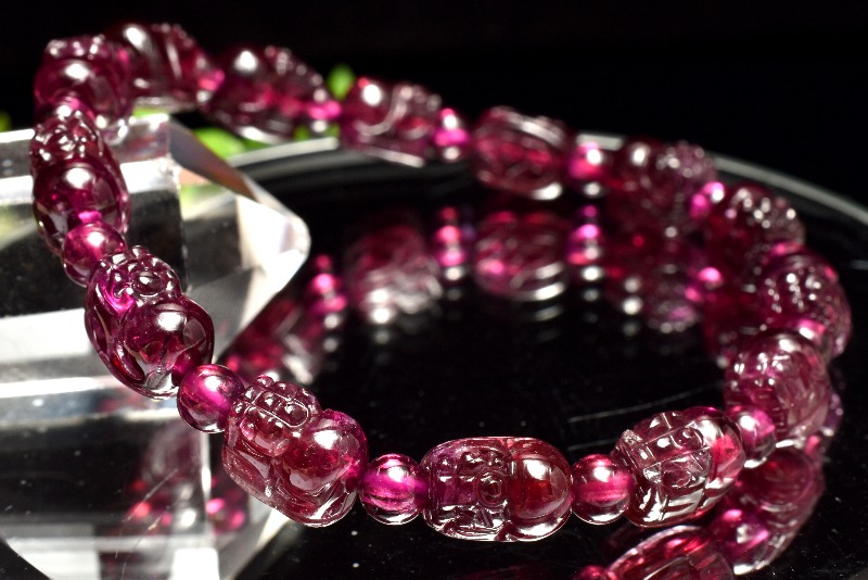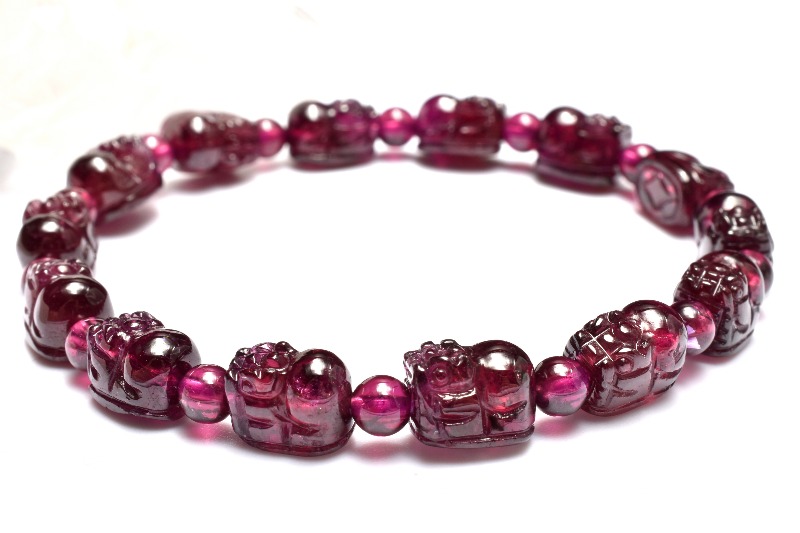 【1点物】透過性あり◇高品質 ロードライトガーネット 8-9x6.5(丸玉4)mm 貔貅彫刻 ブレスレット _MB222