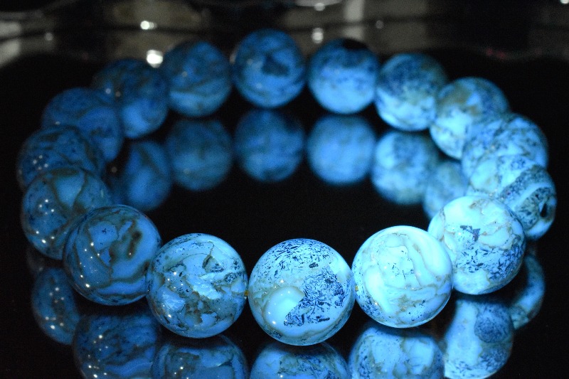 紫外線を当てると透明感のあるブルーに輝き神秘さを感じます。