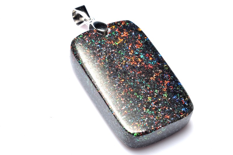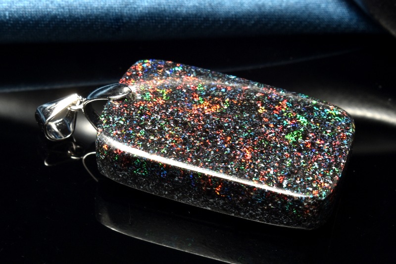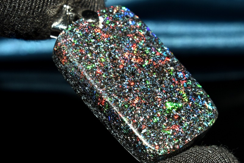 肉眼でも遊色は見られますが、強い光に当てると、まるで宇宙を見ているかのようにキラキラと煌めく美しいタイプ。