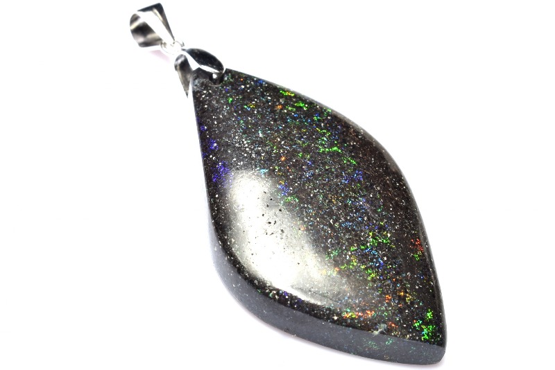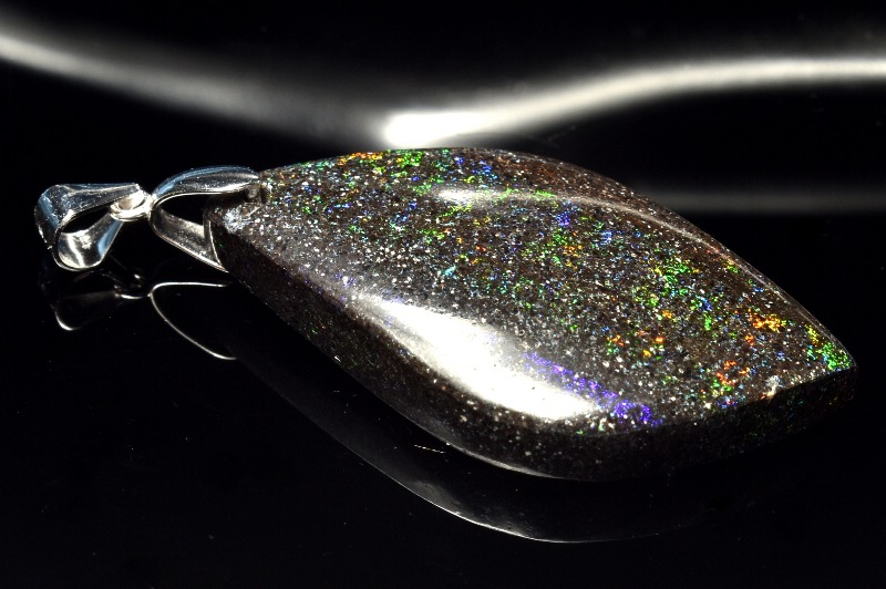 肉眼でも遊色は見られますが、強い光に当てると、まるで宇宙を見ているかのようにキラキラと煌めく美しいタイプ。