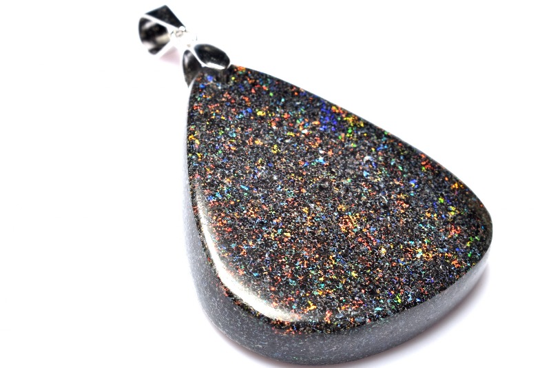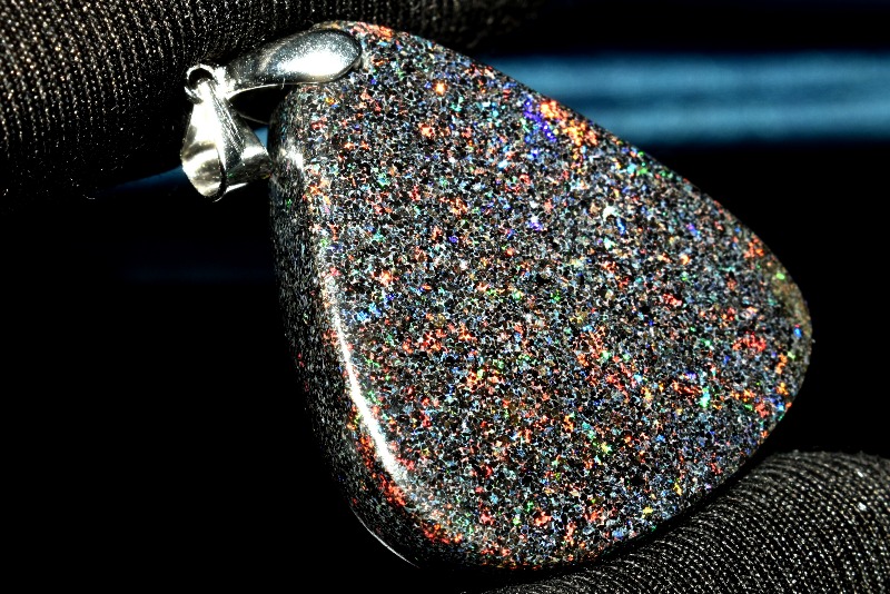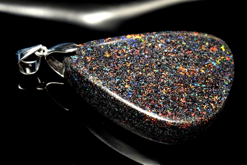 肉眼でも遊色は見られますが、強い光に当てると、まるで宇宙を見ているかのようにキラキラと煌めく美しいタイプ。