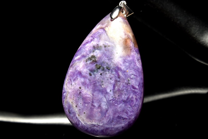 「チャロアイト」は、「スギライト」や「ラリマー」と同じく、世界三大ヒーリングストーンの一つに数えられる石です。油彩画のような質感を持つ芸術的な印象を持つ石で、この不思議な模様は、黒色:エジリン(Aegirine錐輝石)、帯状の灰色:マイクロクリン(Microcline微斜長石)、白色:カリ長石(PotassiumFeldspar)、黄緑色:カナサイト(Canasite)、淡黄色:ティクナクサイト(Tinaksite)などの鉱物が、マーブル状に混ざりあうことから成り立っています。薄紫色の彩色は不純物のマンガンに起因します。