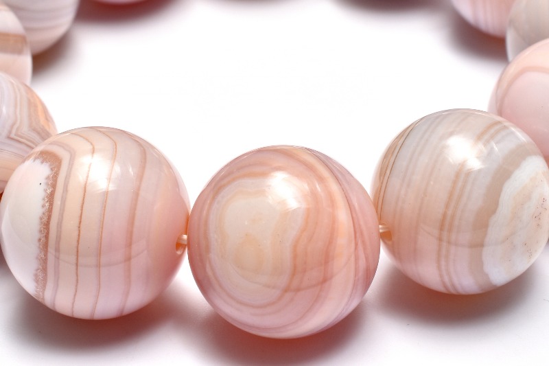 アゲート(めのう)の一種で、色合いはアイボリー、ベージュ、ブラウンなど落ち着いた色合いのものや、オレンジ、ピンクなども見られます。