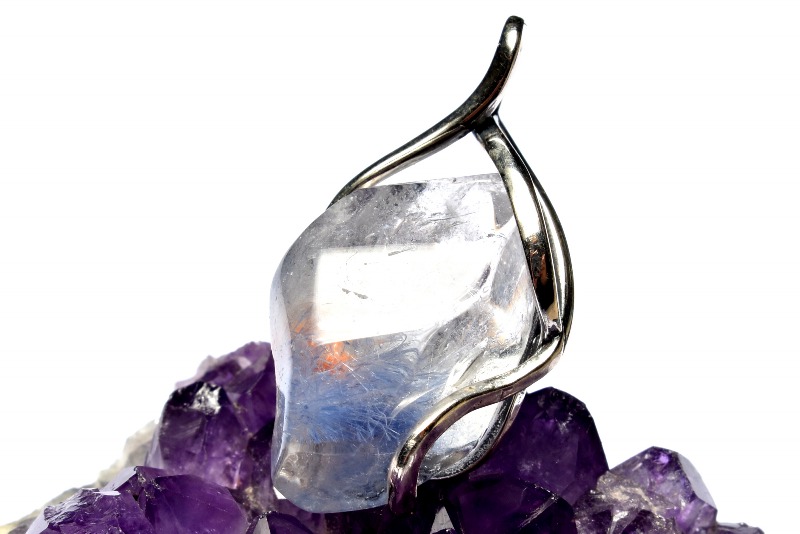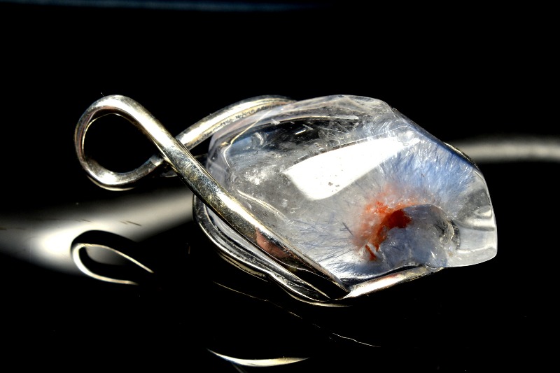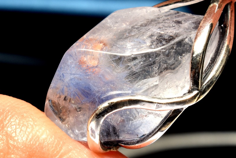 水晶の中でフワフワと青い華が咲いているような内包物が神秘的で美しいです。