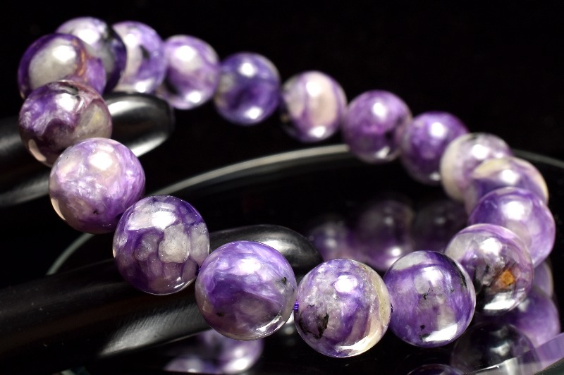 チャロアイトという名前の由来には、シベリアのチャロ川流域で発見された事とする説と、ロシア語の(Charo魅惑)から名づけられたという説がありますが、後者の方が有力であるとされています。その名の通り、この石の個性的な模様は、見る人を魅了してやみません。まさに、「魅惑の宝石」にぴったりな石です。