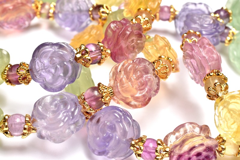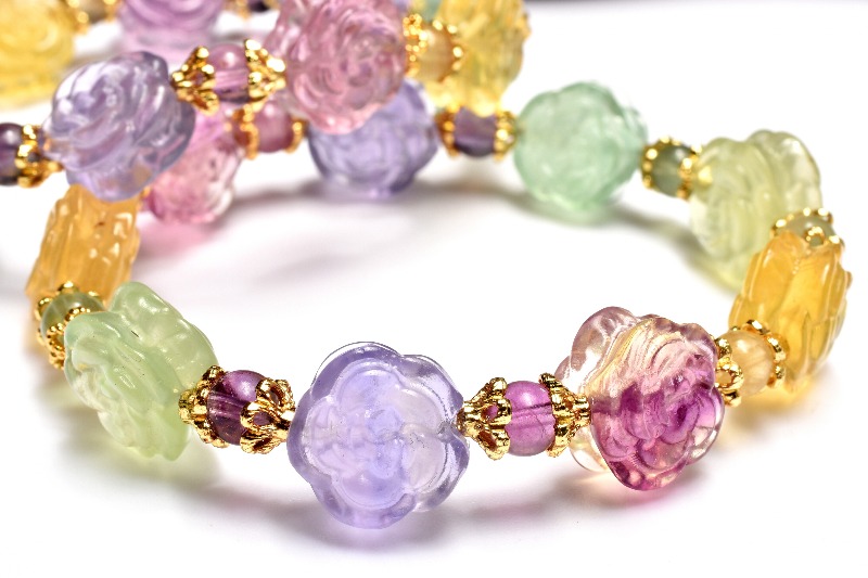 繊細彫刻◇マルチカラー フローライト 13x13(丸玉5.5)mm 両面バラ彫刻 ブレスレット 1個売り _BG6160-2