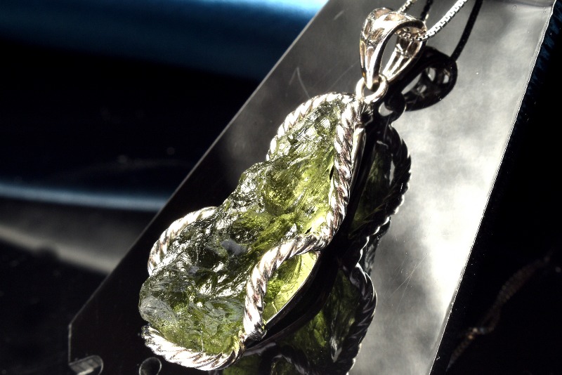 テクタイトは、遥か昔、地球に隕石が衝突した際に、その衝撃で地表の岩石が融解・飛散し、それらが冷やされてガラス質状に固まったものであるとされています。テクタイトは黒色ですが、モルダバイトは緑色、または褐色がかった透明で、ガラス光沢を放っています。