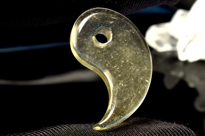 内部に鉄やニッケル等の隕石成分が混ざって発見されることもあるそうです。丸い気泡がバラバラに混在している中、溶融時に流れた模様が穏やかであることから、瞬時にしてガラス化したことがわかります。